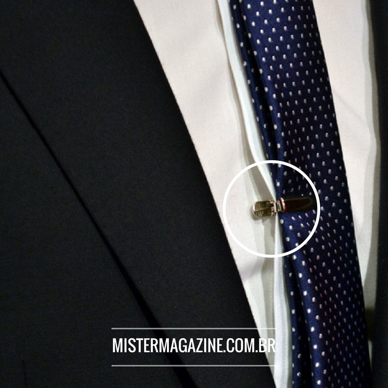 Como o próprio nome diz, mais do que uma declaração de estilo, essa pequena peça de metal serve para manter sua gravata no lugar. Ao usá-lo, certifique-se de prendê-lo (junto com a gravata) a faixa de tecido (vista) onde ficam os botões de sua camisa. Assim, sua gravata ficará sempre no lugar.